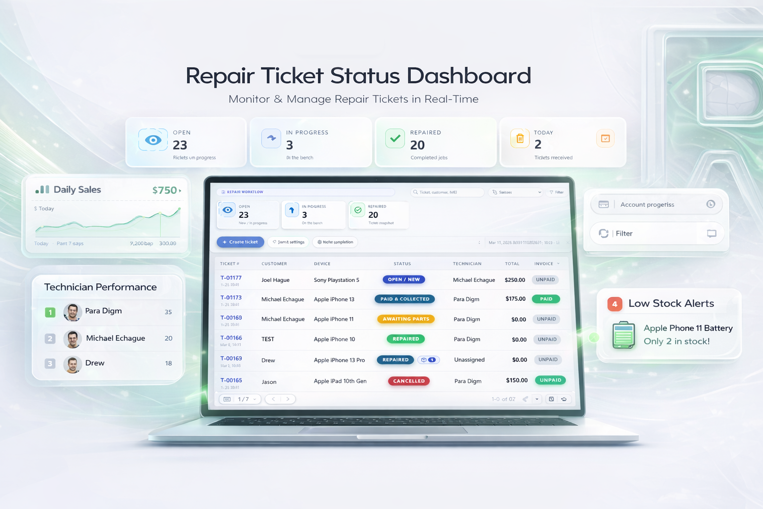 Create, manage, and track repair tickets from check-in to completion. Keep device details, technician notes, and repair status organized in one workflow.
